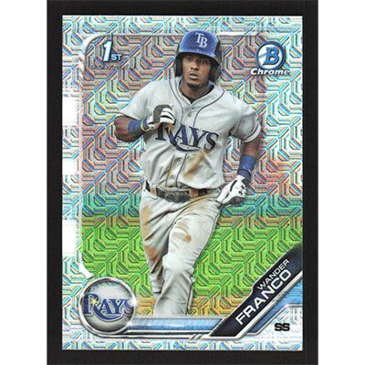 This is a 2019 Bowman Chrome Mega Box Prospects Refractors Wander Franco baseball card. The card is #BCP-100 and pictures show condition. Team(s): Tampa Bay Rays