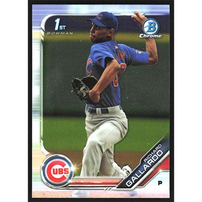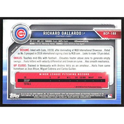 This is a 2019 Bowman Chrome Prospects Richard Gallardo baseball card. The card is #BCP-188 and pictures show condition.