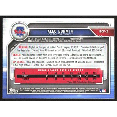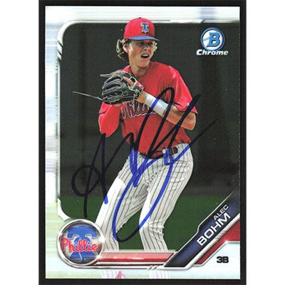 This is a 2019 Bowman Chrome Prospects Alec Bohm autographed baseball card. This card has been signed, in blue, by Alec Bohm, and is guaranteed authentic by Ballcardz.com. The card is #BCP-2 and pictures show condition.