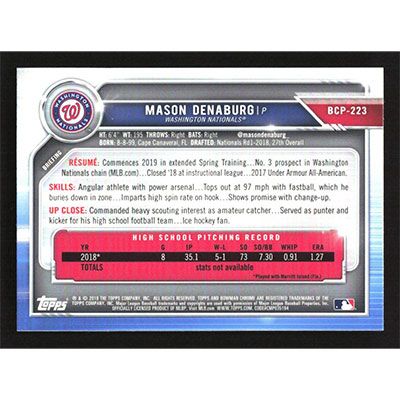 This is a 2019 Bowman Chrome Prospects Mason Denaburg baseball card. The card is #BCP-223 and pictures show condition.