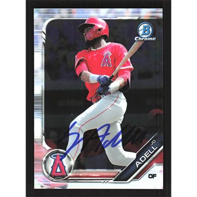 This is a 2019 Bowman Chrome Prospects Jo Adell autographed baseball card. This card has been signed, in blue, by Jo Adell, and is guaranteed authentic by Ballcardz.com. The card is #BCP-250 and pictures show condition.