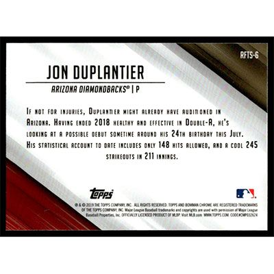 This is a 2019 Bowman Chrome Ready for the Show Jon Duplantier baseball card. The card is #RFTS-6 and pictures show condition. Team(s): Arizona Diamondbacks