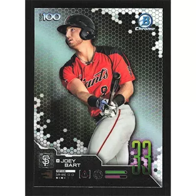 This is a 2019 Bowman Chrome Scouts Top 100 Joey Bart baseball card. The card is #BTP-33 and pictures show condition.