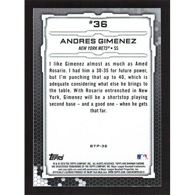 This is a 2019 Bowman Chrome Scouts Top 100 Andres Gimenez baseball card. The card is #BTP-36 and pictures show condition.