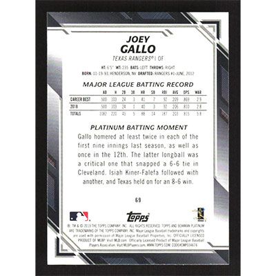 This is a 2019 Bowman Platinum Joey Gallo baseball card. The card is #69 and pictures show condition.