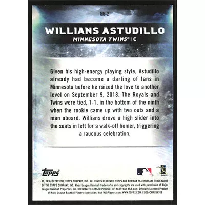 This is a 2019 Bowman Platinum Renowned Rookies Willians Astudillo baseball card. The card is #RR-2 and pictures show condition. Team(s): Minnesota Twins Rookie Card (RC)