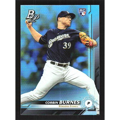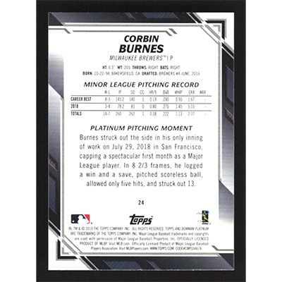 This is a 2019 Bowman Platinum Sky Blue Corbin Burnes baseball card. The card is #24 and pictures show condition. Team(s): Milwaukee Brewers Rookie Card (RC)