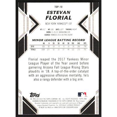 This is a 2019 Bowman Platinum Top Prospects Sky Blue Estevan Florial baseball card. The card is #TOP-10 and pictures show condition. Team(s): New York Yankees