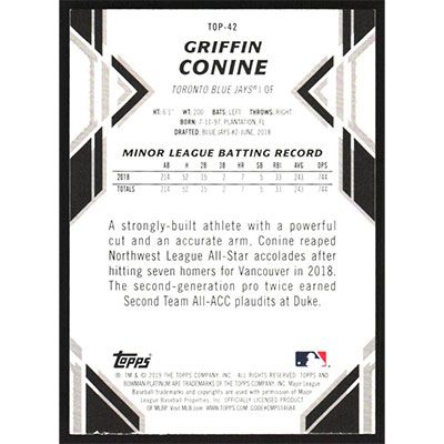 This is a 2019 Bowman Platinum Top Prospects Sky Blue Griffin Conine baseball card. The card is #TOP-42 and pictures show condition. Team(s): Toronto Blue Jays