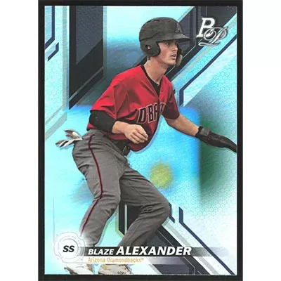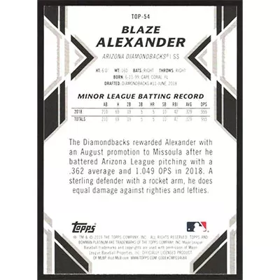 This is a 2019 Bowman Platinum Top Prospects Sky Blue Blaze Alexander baseball card. The card is #TOP-54 and pictures show condition. Team(s): Arizona Diamondbacks