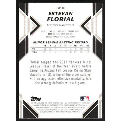 This is a 2019 Bowman Platinum Top Prospects Estevan Florial baseball card. The card is #TOP-10 and pictures show condition.