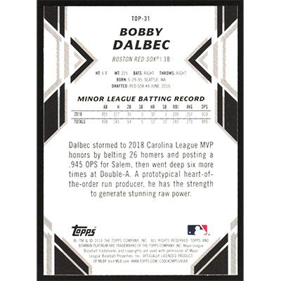 This is a 2019 Bowman Platinum Top Prospects Bobby Dalbec baseball card. The card is #TOP-31 and pictures show condition.