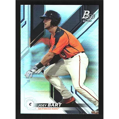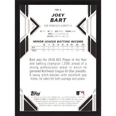 This is a 2019 Bowman Platinum Top Prospects Joey Bart baseball card. The card is #TOP-4 and pictures show condition.