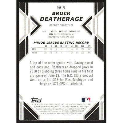 This is a 2019 Bowman Platinum Top Prospects Brock Deatherage baseball card. The card is #TOP-75 and pictures show condition.