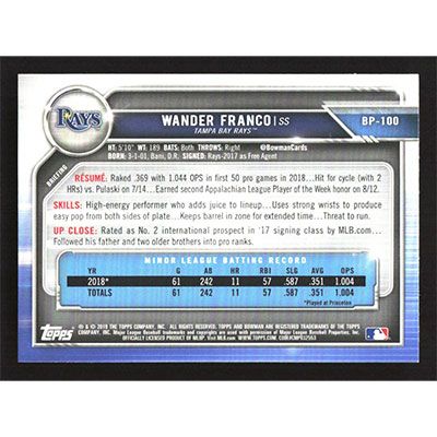 This is a 2019 Bowman Prospects Wander Franco autographed baseball card. This card has been signed, in blue, by Wander Franco, and is guaranteed authentic by Ballcardz.com. The card is #BP-100 and pictures show condition.