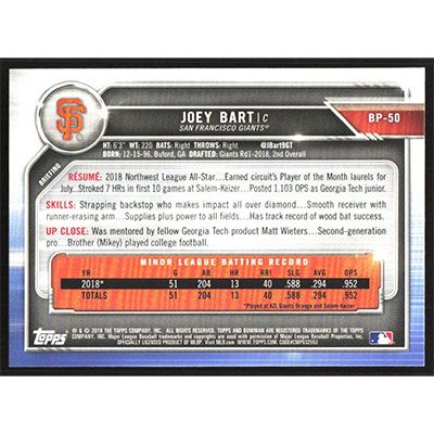 This is a 2019 Bowman Prospects Joey Bart autographed baseball card. This card has been signed, in blue, by Joey Bart, and is guaranteed authentic by Ballcardz.com. The card is #BP-50 and pictures show condition.