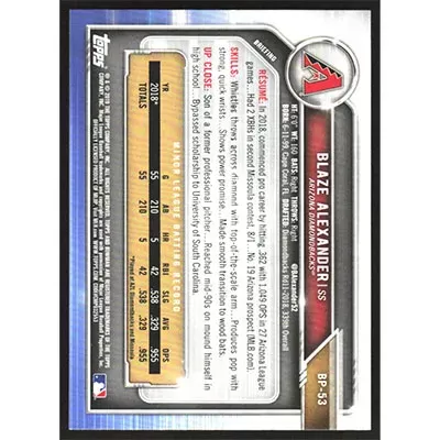 This is a 2019 Bowman Prospects Blaze Alexander baseball card. The card is #BP-53 and pictures show condition.
