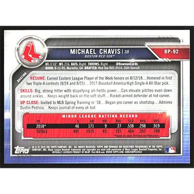 This is a 2019 Bowman Prospects Michael Chavis autographed baseball card. This card has been signed, in blue, by Michael Chavis, and is guaranteed authentic by Ballcardz.com. The card is #BP-92 and pictures show condition.