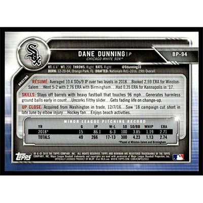 This is a 2019 Bowman Prospects Camo Dane Dunning baseball card. The card is #BP-94 and pictures show condition.