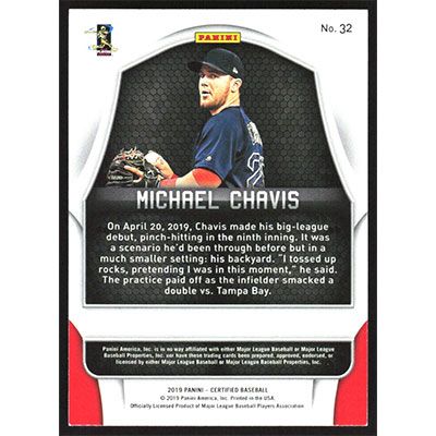 This is a 2019 Certified Michael Chavis baseball card. The card is #32 and pictures show condition.