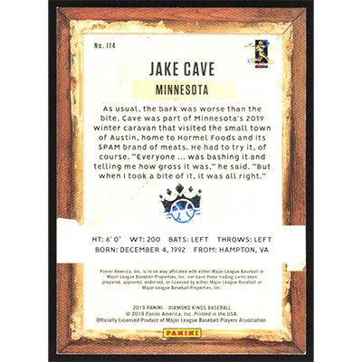 This is a 2019 Diamond Kings Jake Cave SP baseball card. The card is #114 and pictures show condition.