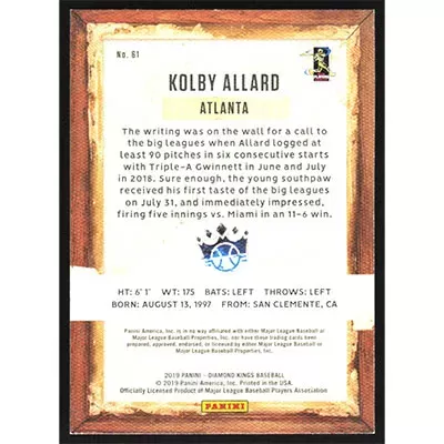This is a 2019 Diamond Kings Kolby Allard baseball card. The card is #61 and pictures show condition.