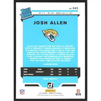 This is a 2019 Donruss Josh Allen Rated Rookie football card. The card is #343 and pictures show condition.