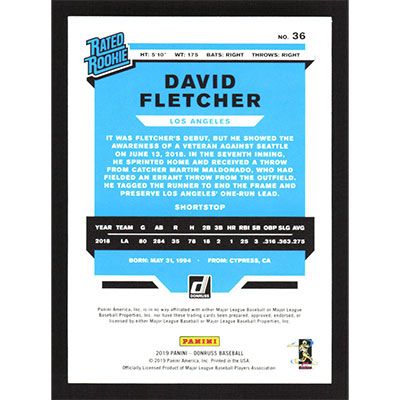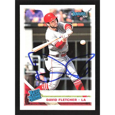 This is a 2019 Donruss David Fletcher autographed baseball card. This card has been signed, in blue, by David Fletcher, and is guaranteed authentic by Ballcardz.com. The card is #36 and pictures show condition.