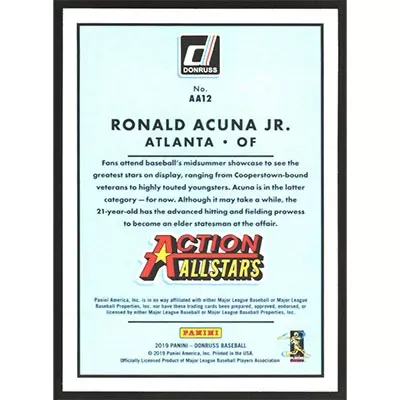 This is a 2019 Donruss Action All-Stars Pink Fireworks Ronald Acuña Jr. baseball card. The card is #AA12 and pictures show condition. Team(s): Atlanta Braves