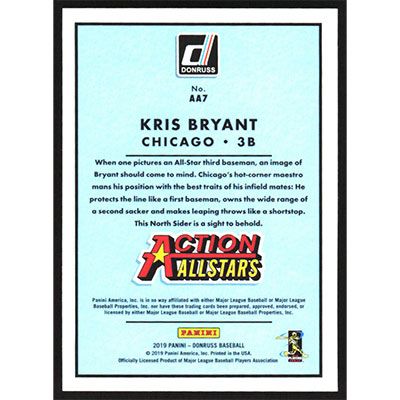 This is a 2019 Donruss Action All-Stars Pink Fireworks Kris Bryant baseball card. The card is #AA7 and pictures show condition.