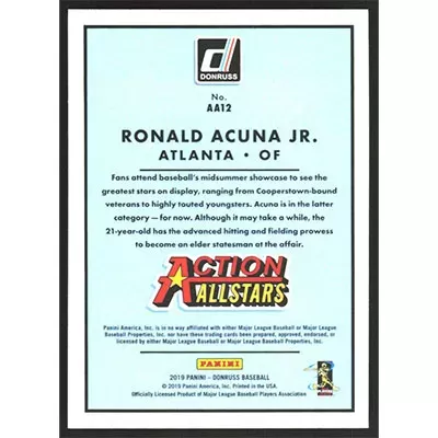 This is a 2019 Donruss Action All-Stars Rapture Ronald Acuña Jr. baseball card. The card is #AA12 and pictures show condition.