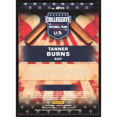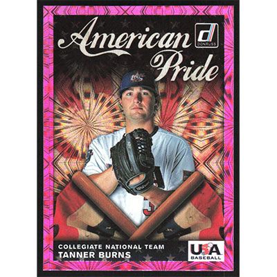 This is a 2019 Donruss American Pride Pink Fireworks Tanner Burns baseball card. The card is #AP20 and pictures show condition.
