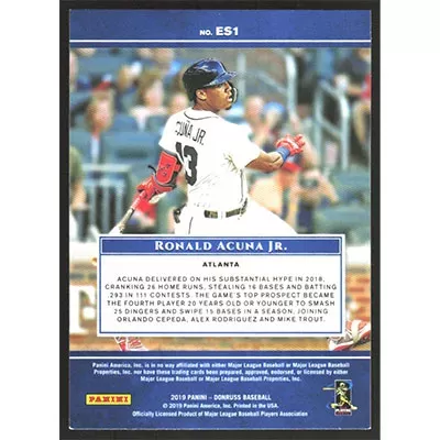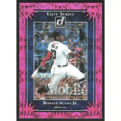 This is a 2019 Donruss Elite Series Pink Fireworks Ronald Acuña Jr. baseball card. The card is #ES1 and pictures show condition.