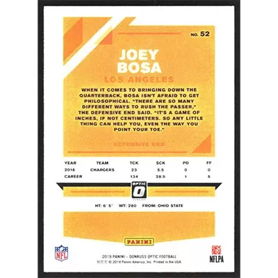 This is a 2019 Donruss Optic Joey Bosa football card. The card is #52 and pictures show condition.