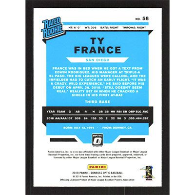 This is a 2019 Donruss Optic Ty France Rated Rookie baseball card. The card is #58 and pictures show condition. Team(s): San Diego Padres Rookie Card (RC)