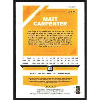 This is a 2019 Donruss Optic Holo Matt Carpenter baseball card. The card is #171 and pictures show condition.