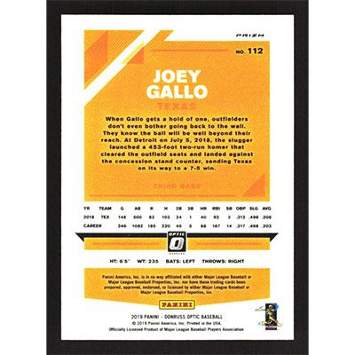 This is a 2019 Donruss Optic Lime Green Joey Gallo baseball card. The card is #112 and pictures show condition.