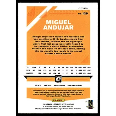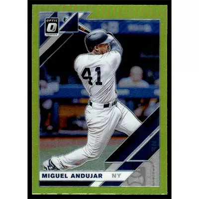 This is a 2019 Donruss Optic Lime Green Miguel Andujar baseball card. The card is #129 and pictures show condition.