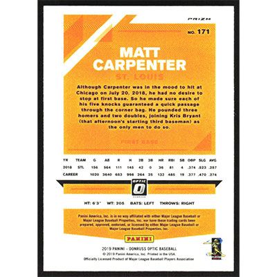 This is a 2019 Donruss Optic Lime Green Matt Carpenter baseball card. The card is #171 and pictures show condition.