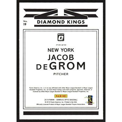 This is a 2019 Donruss Optic Lime Green Jacob deGrom Diamond Kings baseball card. The card is #19 and pictures show condition.