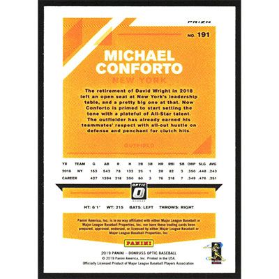 This is a 2019 Donruss Optic Lime Green Michael Conforto baseball card. The card is #191 and pictures show condition.