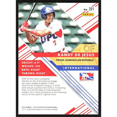 This is a 2019 Elite Extra Edition Randy De Jesus baseball card. The card is #201 and pictures show condition. This card is limited; #'d 586/999. Team(s): Dominican Republic