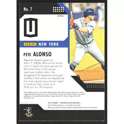 This is a 2019 Panini Chronicles Unparalleled Astral Pete Alonso baseball card. The card is #7 and pictures show condition. Team(s): New York Mets Rookie Card (RC)