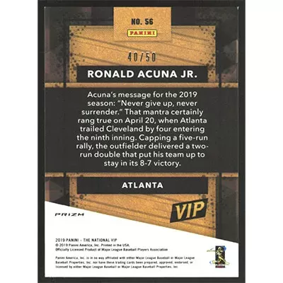 This is a 2019 Panini National Convention VIP Party Pink Ronald Acuña Jr. baseball card. The card is #56 and pictures show condition. This card is limited; #'d 40/50.