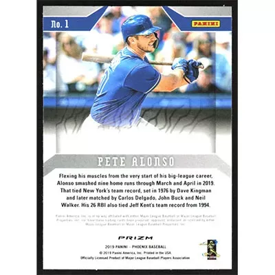 This is a 2019 Panini Phoenix Pete Alonso baseball card. The card is #1 and pictures show condition.