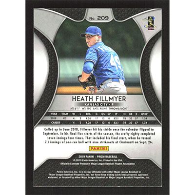 This is a 2019 Panini Prizm Heath Fillmyer baseball card. The card is #209 and pictures show condition. Team(s): Kansas City Royals Rookie Card (RC)
