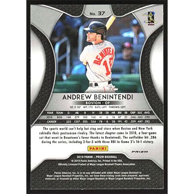This is a 2019 Panini Prizm Cosmic Haze Andrew Benintendi baseball card. The card is #37 and pictures show condition.