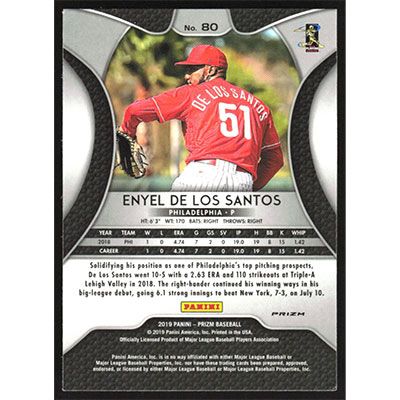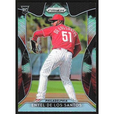 This is a 2019 Panini Prizm Cosmic Haze Enyel De Los Santos baseball card. The card is #80 and pictures show condition. Team(s): Philadelphia Phillies Rookie Card (RC)