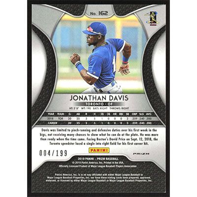 This is a 2019 Panini Prizm Lime Green Donut Circles Jonathan Davis baseball card. The card is #162 and pictures show condition. This card is limited; #'d 004/199.