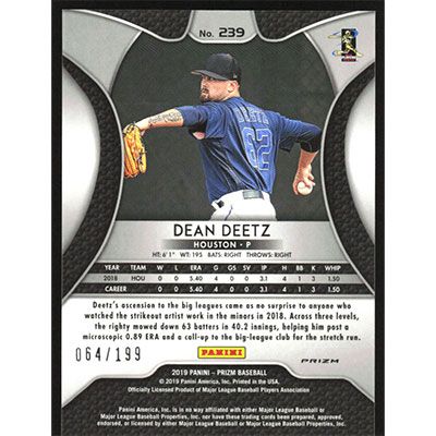 This is a 2019 Panini Prizm Lime Green Donut Circles Dean Deetz baseball card. The card is #239 and pictures show condition. This card is limited; #'d 064/199.